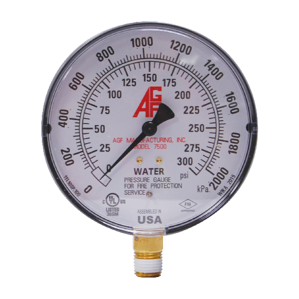 AGF’s Model 7500 pressure gauge is a UL Certified and FM Approved, 4″ pressure gauge designed for use on wet fire sprinkler systems. Designed to meet NFPA 13 requirements. AGF recommends the 3-way universal gauge valve to connect this pressure gauge to the system. The 7500 pressure gauge is sold individually or comes preassembled on certain RiserPACK and TESTanDRAIN products. Part number 650.